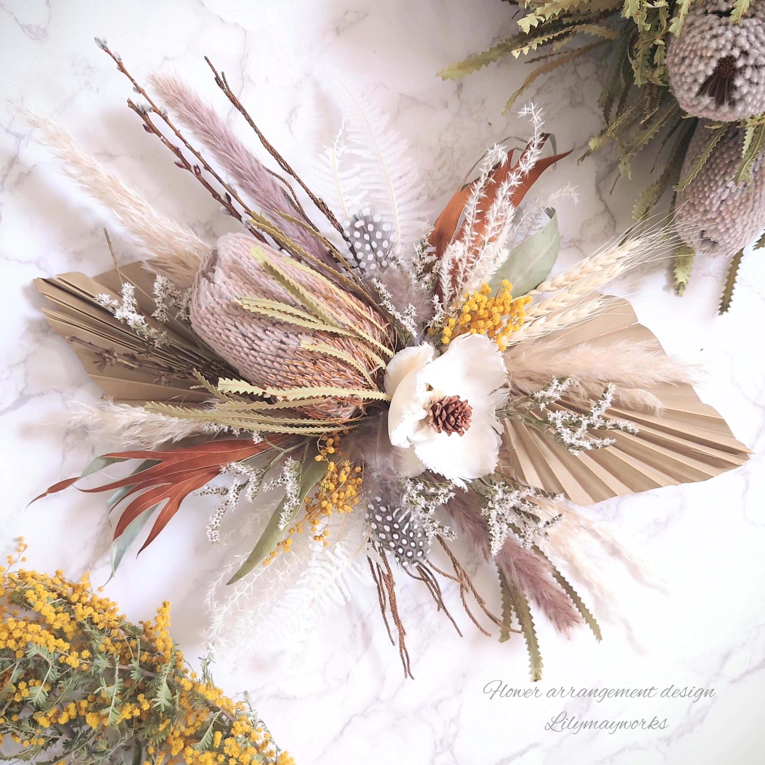 花やグリーンの色、形、ボリュームを考慮し、それぞれの個性を活かすよう考えながら時間をかけて作品を制作しております事をご理解お願い致します(*ᴗ͈ˬᴗ͈)⁾⁾⁾